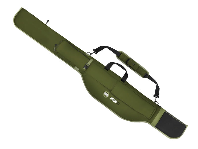 Dzięki temu nie ma niebezpieczeństwa wzajemnego uszkodzenia 2 wędek podczas transportu. Obie wewnętrzne komory na wędki można przymocować za pomocą rzepu na górze. Dzięki przedłużonej części do przechowywania kołowrotków zmieszczą się wszystkie standardowe zestawy karpiowe, pomyśleliśmy również o wędziskach z przelotkami o średnicy 50 mm, na które w poszczególnych komorach jest wystarczająco dużo miejsca. Z boku pokrowca znajduje się długa kieszeń zapinana na zamek, która posłuży np. do transportu podbieraka. Ma jednak jeszcze jedną kieszeń z paskiem mocującym, dzięki czemu zapewnia większą przestrzeń i zmienność. Kolejna świetna cecha znajduje się na pasku na ramię, gdzie umieszczono małą kieszonkę, w której można przechowywać drobiazgi. Wysokiej jakości zamki błyskawiczne, wygodna rączki lub pasek na ramię są również częścią pokrowca.